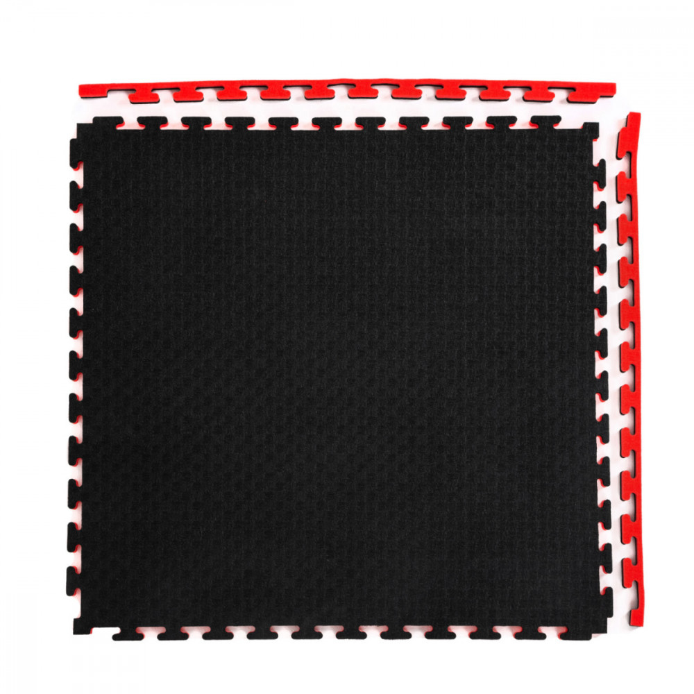 Универсальный двусторонний мат-татами для единоборств (100х100 см, толщина 20 мм). Цвет: черно-красный. Влагостойкое ЭВА-покрытие с замком "ласточкин хвост" для быстрой сборки тренировочных зон.